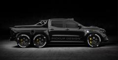 Exy Monster X już na pierwszy rzut oka wyróżnia się sześcioma kołami. Jednak ten element jest chyba najbardziej przyziemny. Całe nadwozie tej bestii zostało bowiem wykonane z włókna węglowego. Jak widzimy karoseria nie tylko się wydłużyła, ale jest też znacznie szersza i cechuje się potężną muskulaturą. Nie zabrakło licznych wlotów powietrza podkreślających potęgę bestii. Wnętrze paki pokryto żółtą farbą perfekcyjnie kontrastującą z karbonowym nadwoziem. Taki sam kolor znalazł się na hakach, zaciskach hamulców czy dachowej belce oświetlenia LED. Nie pokazano zdjęć wnętrza, ale możemy być pewni, że Carlex Design w tym temacie nie zaniżył poziomu.